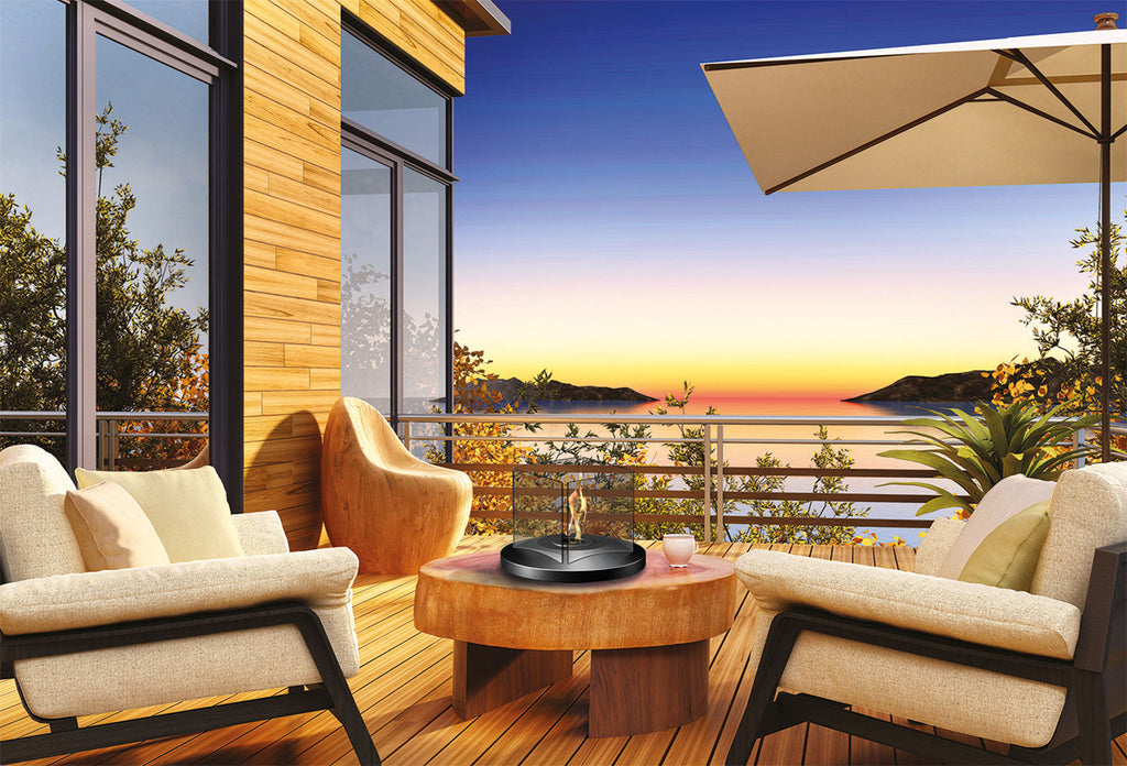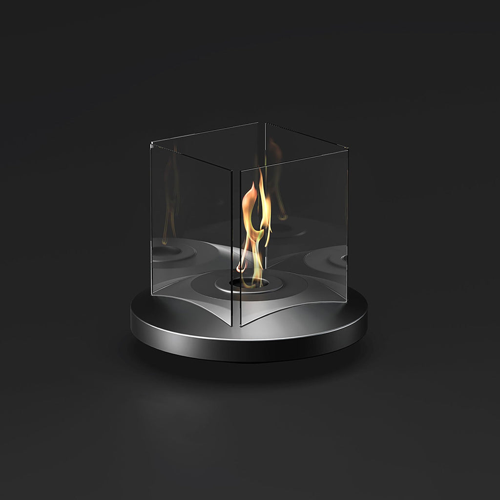 Camino a bioetanolo da tavolo, con 4 vetri temperati di protezione e struttura in acciaio verniciato nero. Dotato di bruciatore con fibra in ceramica e coperchio di chiusura fiamma. Installazione semplice che non richiede canna fumaria e allacciamento elettrico. Certificato secondo la normativa EN 16647:2016.
