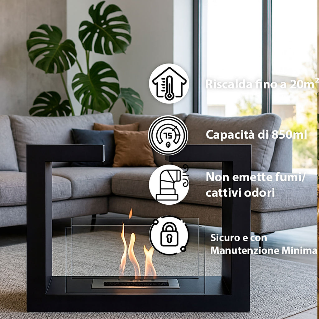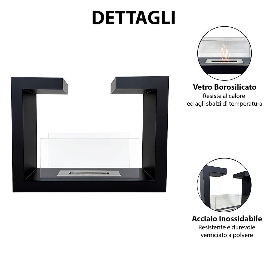Camino a Bioetanolo da Terra Venus Free Standing Geometrico e Vetri Protettivi Serbatoio 850 ml in Acciaio Verniciato Nero