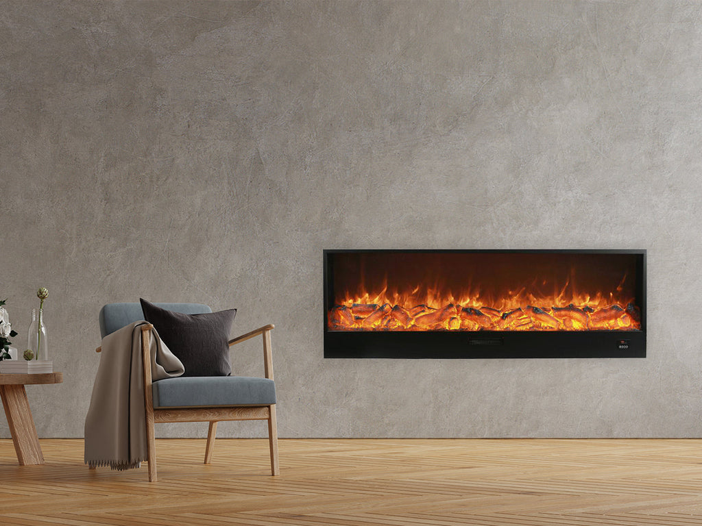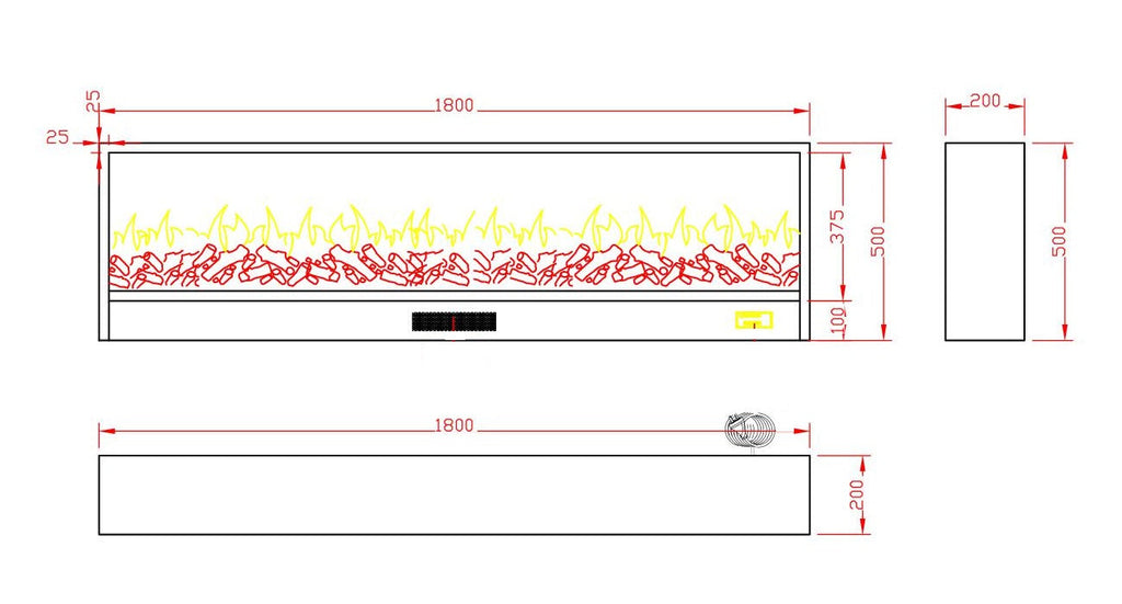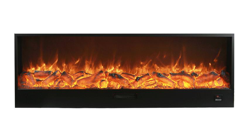 Grande caminetto elettrico da incasso e appoggio modello Amiata, 180 cm di lunghezza, effetto fiamma realizzato mediante LED e regolabile come intensità. Due step di potenza 750-1500W. Possibilità di comandarlo manualmente o con il telecomando incluso. Possibilità di usare il solo effetto fiamma senza la funzione riscaldamento.