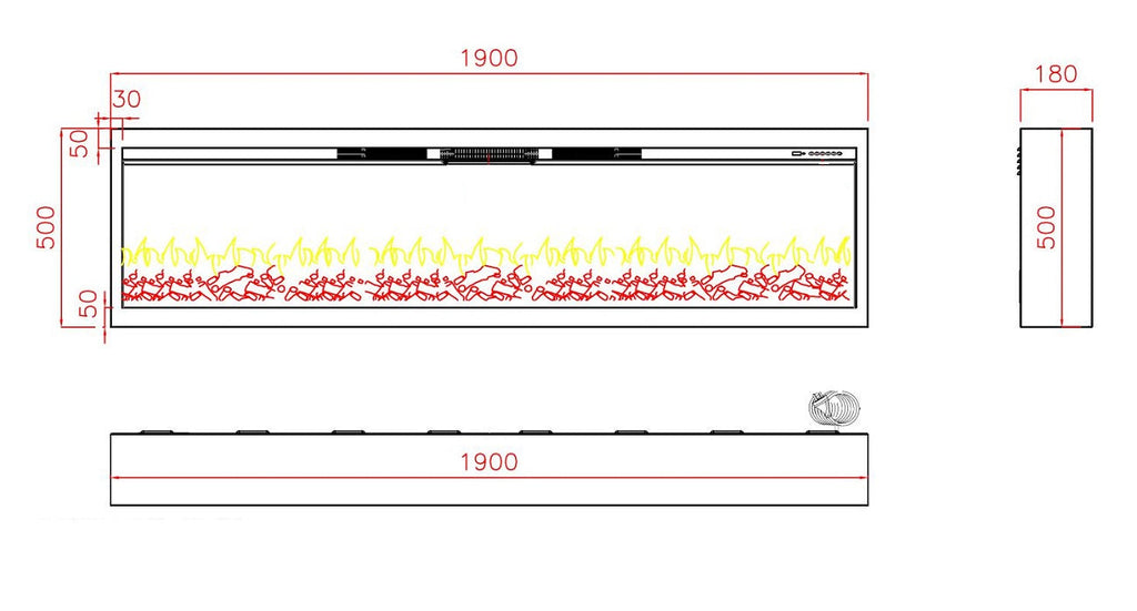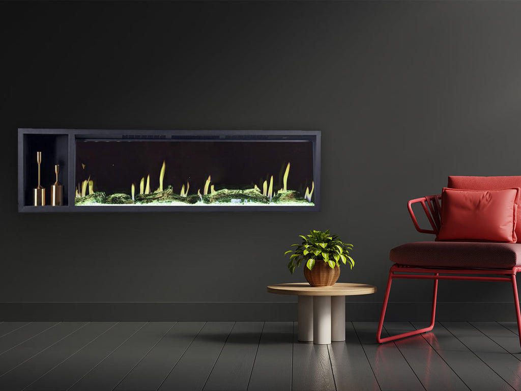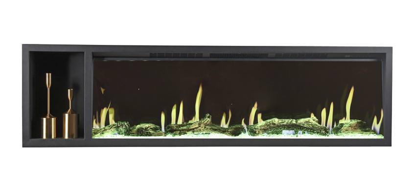 Caminetto elettrico da incasso Stromboli 1,9 m di lunghezza, effetto fiamma realizzato mediante LED colorati e regolabile su 6 livelli di intensità.