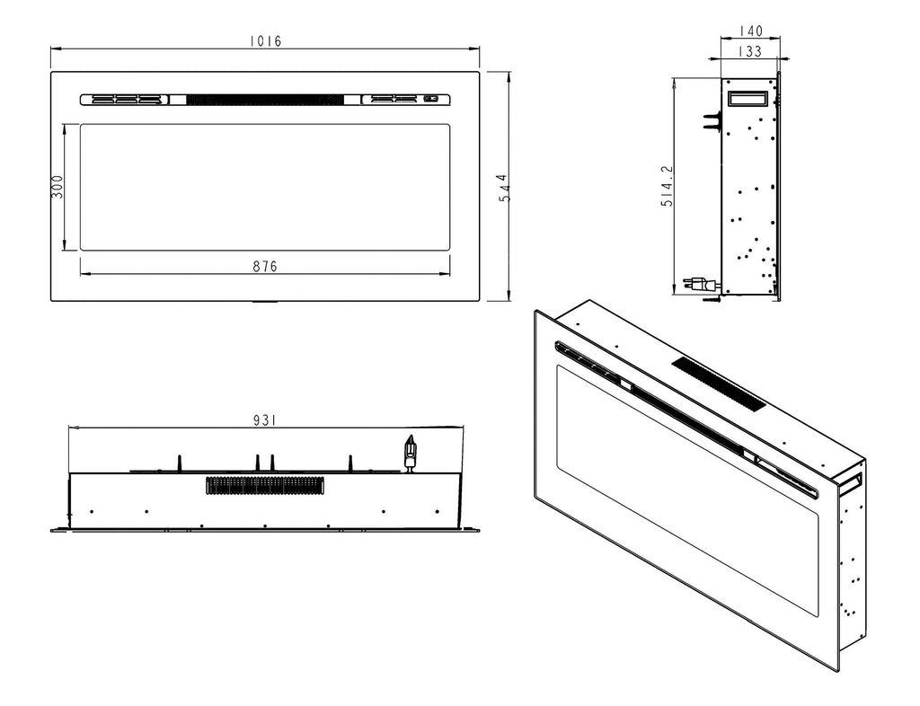 Camino Elettrico da Incasso Effetto Fiamma 101,6x14x54,6 cm 750W/1500W Nero