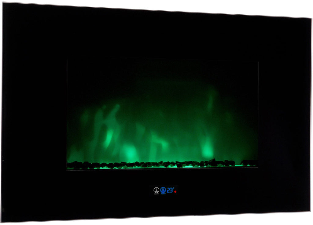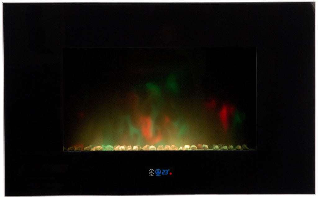 Moderno caminetto elettrico da parete con led colorati modello VOLCANO Con realistici colori della fiamma. 2 selezioni di potenza 1000 e 2000 W. Telecomando incluso e protezione antisurriscaldamento, dotato di Vetro temperato nella parte frontale di 6 mm.