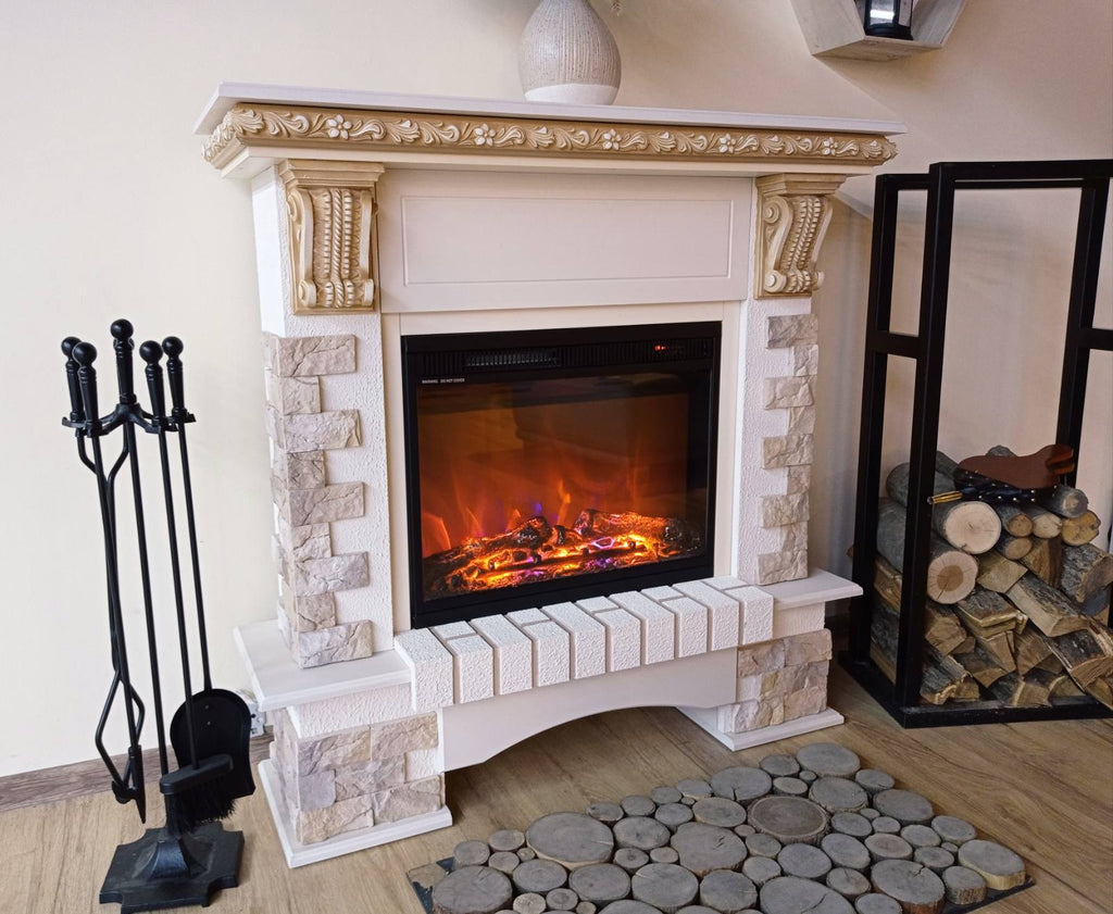 Questo set di caminetti soddisfa tutti gli standard attuali, quali: mobilità, facilità d'uso, consumo di energia, capacità di utilizzare la fiamma senza riscaldamento. È stato prodotto sul colore del gelsomino con pietra artificiale su colonne. Il camino funziona in due modi: riscaldamento e senza riscaldamento, il che significa che puoi goderti il fuoco in qualsiasi momento, giorno e notte.Caratteristiche Tecniche