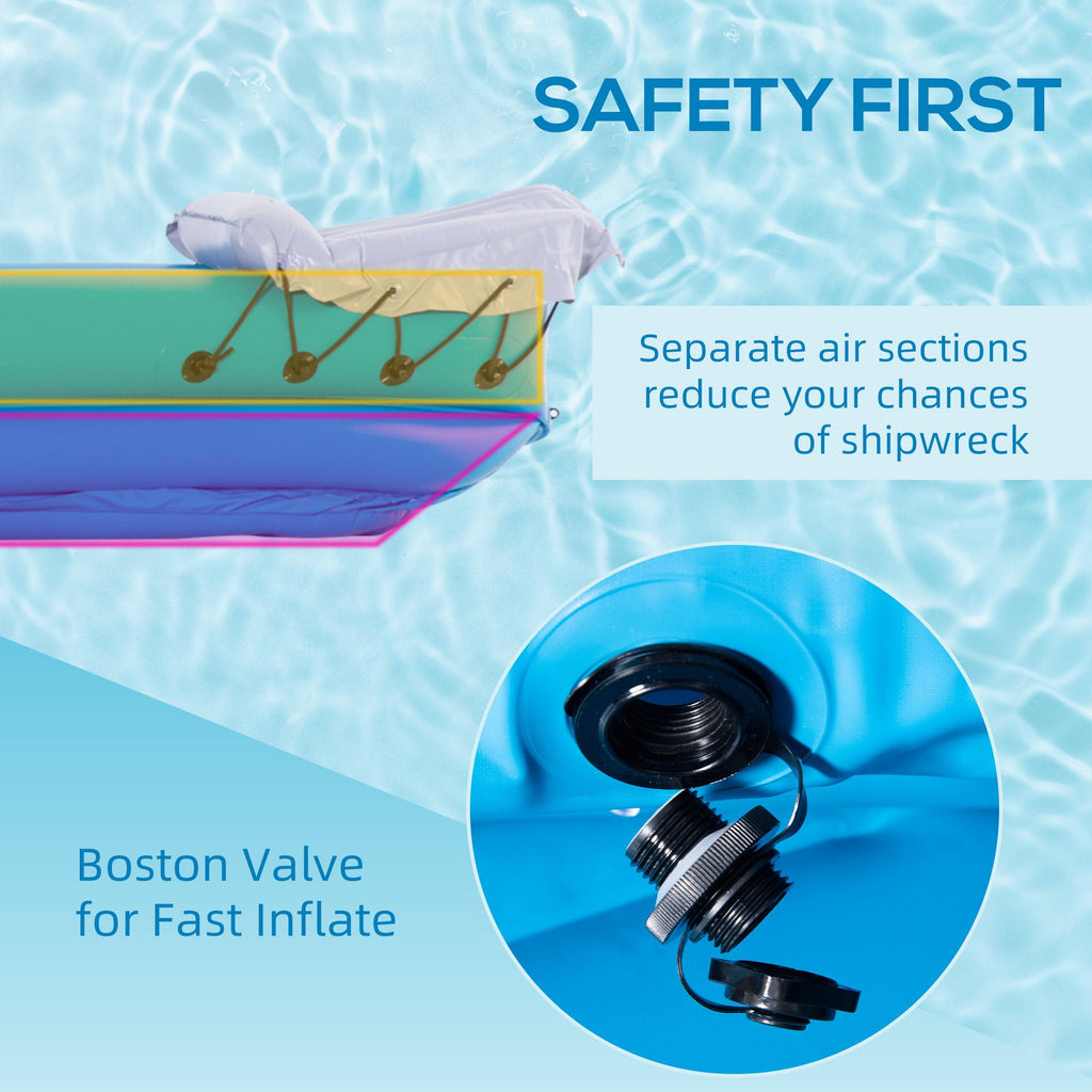- SICURA: Composta da 11 sezioni gonfiabili, questa canoa per 2 persone è progettata per tenerti sempre a galla. Nel caso in cui una delle sezioni si forasse, le altre 10 restano gonfie e ti aiutano a continuare la navigazione