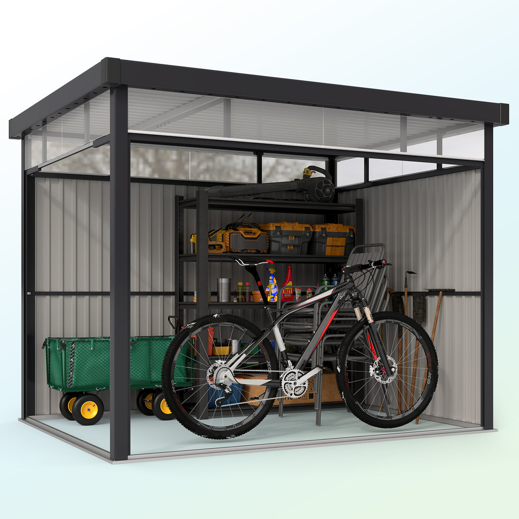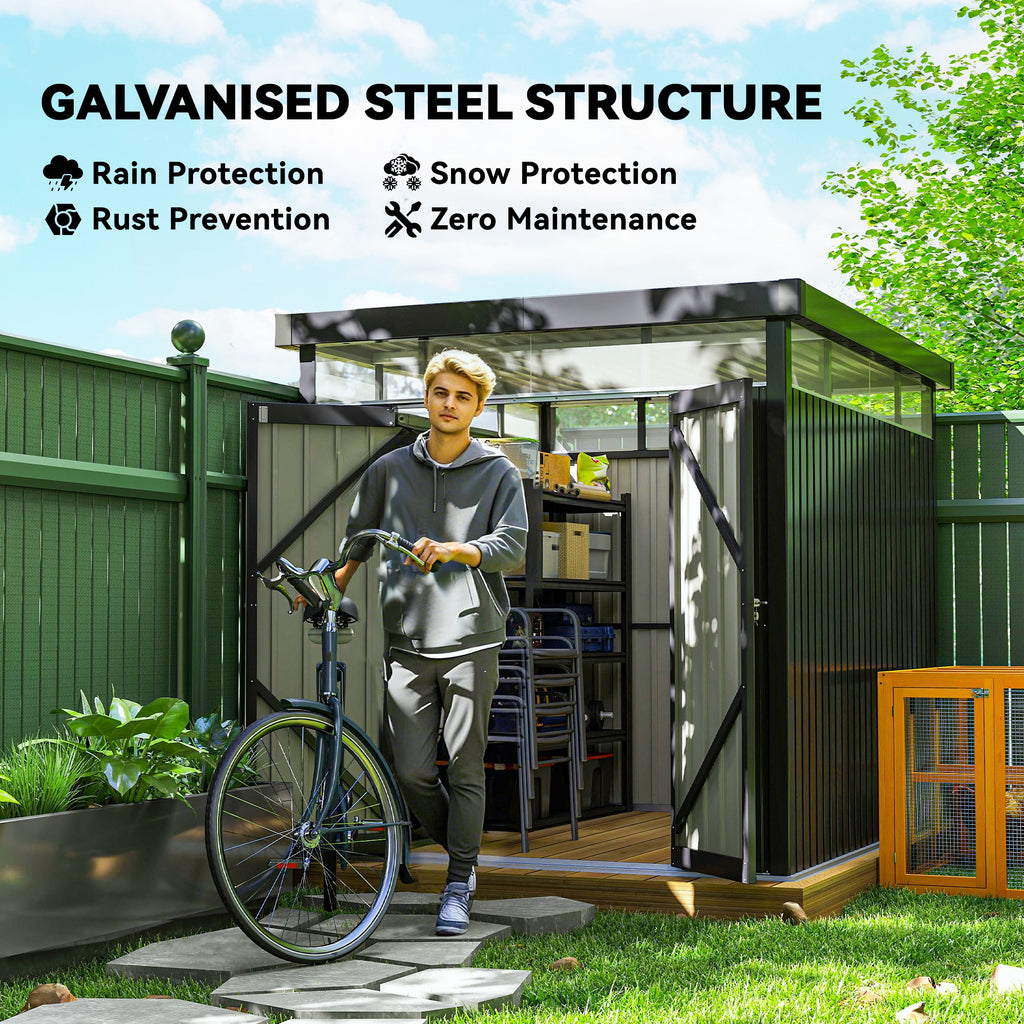 Non privarti della presenza di questo capanno da giardino, l'alleato perfetto per organizzare gli spazi esterni! L'interno da 1.83x2.41 m offre ampio spazio per riporre attrezzi e accessori vari per uso esterno. La luce naturale riesce a entrare dal lucernario in acrilico, mentre la robusta struttura in acciaio zincato protegge dagli agenti atmosferici, assicurando sicurezza e robustezza al contenuto.