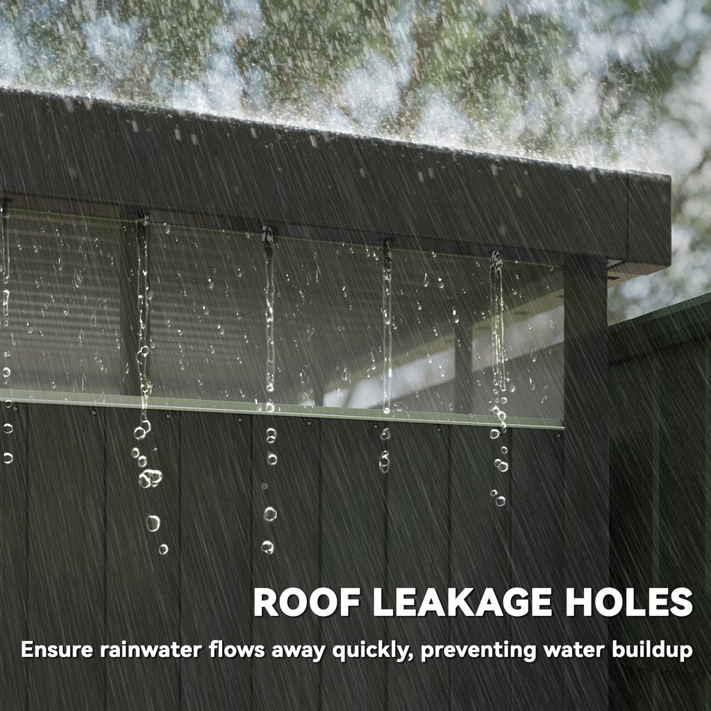 - DESIGN ANTIPIOGGIA: La presenza di fori per il drenaggio dell'acqua sul nostro capanno porta attrezzi garantisce il deflusso veloce della pioggia, evitando accumuli d'acqua al suo interno e mantenendo i tuoi oggetti sempre asciutti