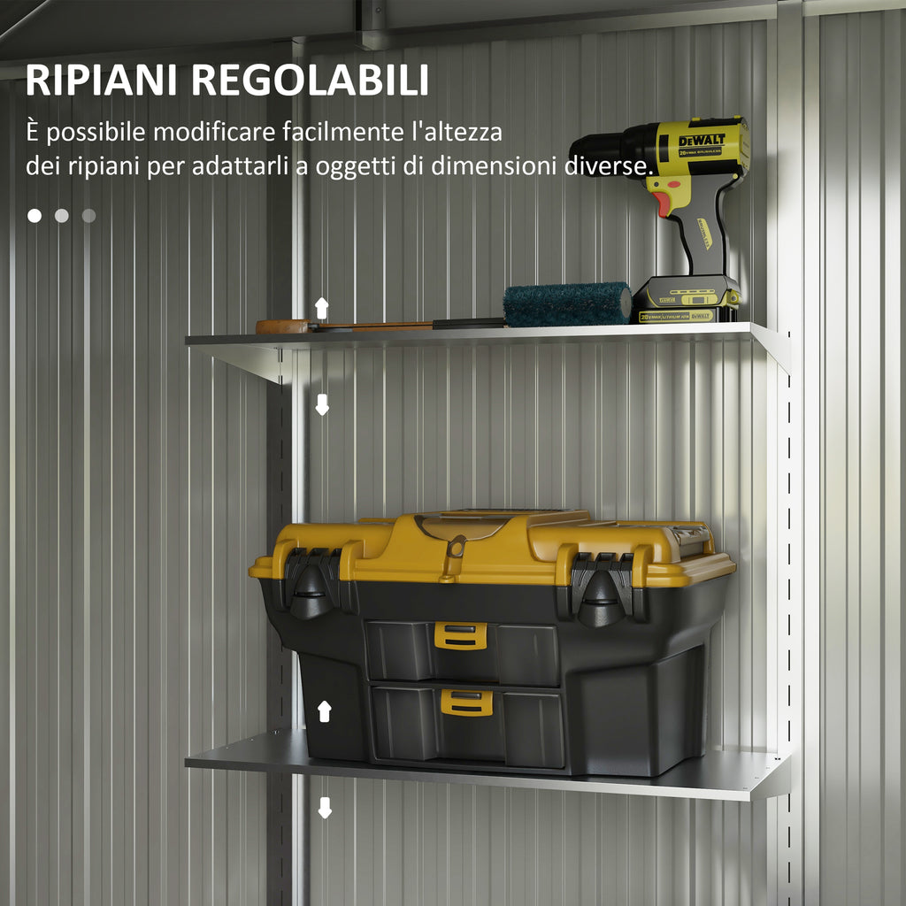 - Capanno porta attrezzi con ripiani regolabili per accogliere oggetti di diverse dimensioni