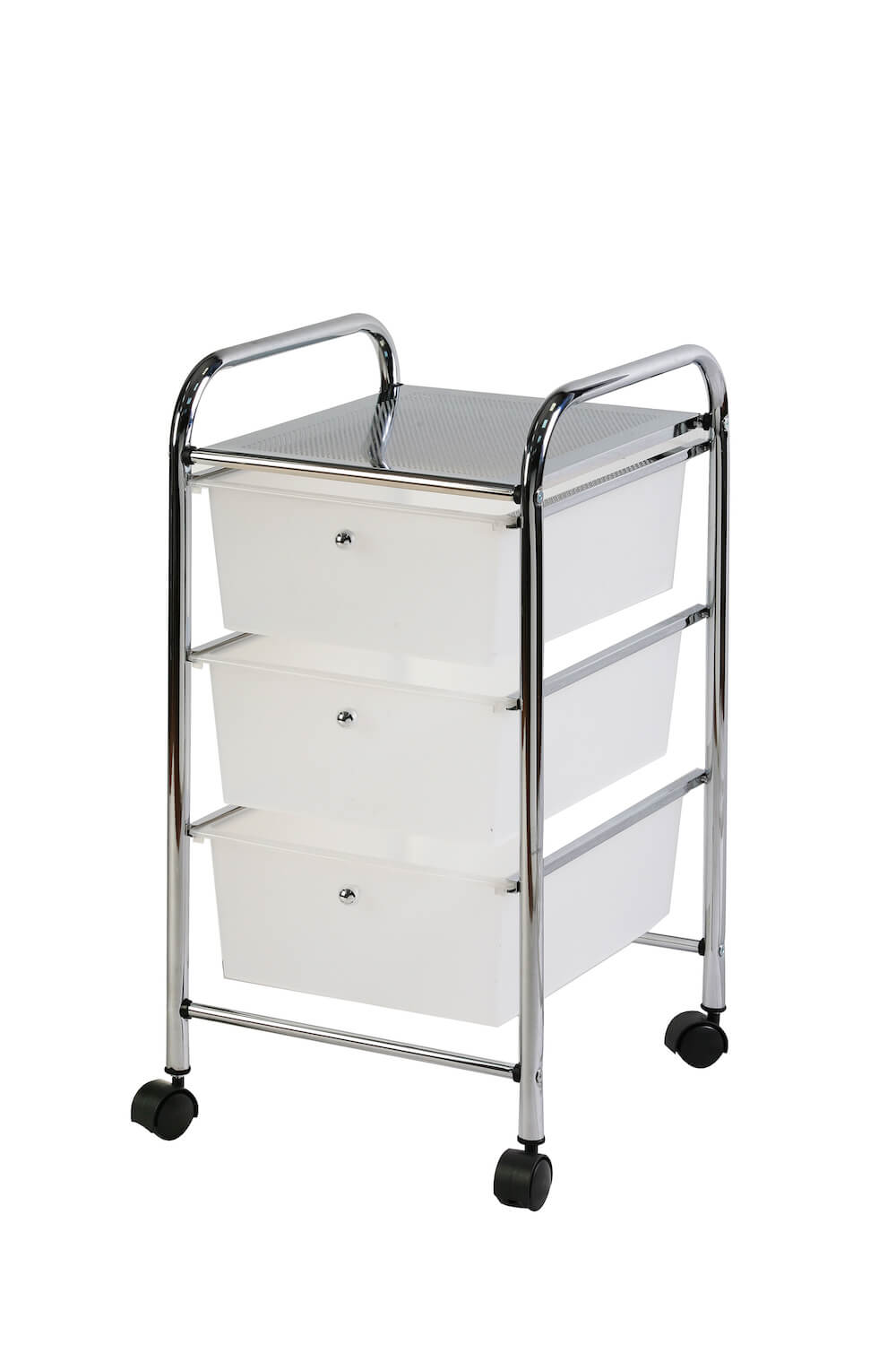 Struttura in acciaio cromato con 3 cassetti asportabili bianchi in plastica.