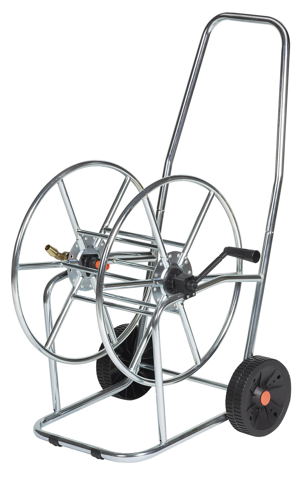 Carrello avvolgitubo semiprofessionale in acciaio. La finitura zinco-cromata rende il carrello particolarmente elegante, oltre che resistente agli agenti esterni. Può raccogliere fino a 80 metri di tubo 3/4, dotato di manovella in metallo ricoperto con plastica. Il carrello viene fornito con un portagomma in plastica ed un portagomma curvo girevole in ottone, entrambi per tubo 3/4. Il telaio a due portanti e le robuste ruote di grande diametro garantiscono la massima stabilità e permettono la movimentazione del carrello senza sforzo.
