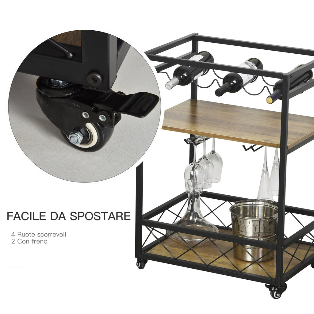 Carrello da Cucina 77x44,5x91 cm 3 Ripiani Portabicchieri e Ruote in Legno e Metallo