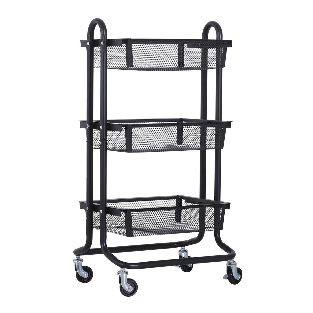 Carrello da Cucina Multiuso Salvaspazio 3 Livelli in Acciaio a Rete Nero 47x38.5x89 cm
