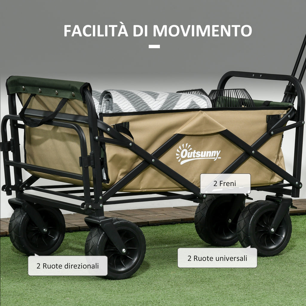 Carrello da Giardino 110L con Maniglia Telescopica e Fondo Apribile in Acciaio e Tessuto Oxford Cachi