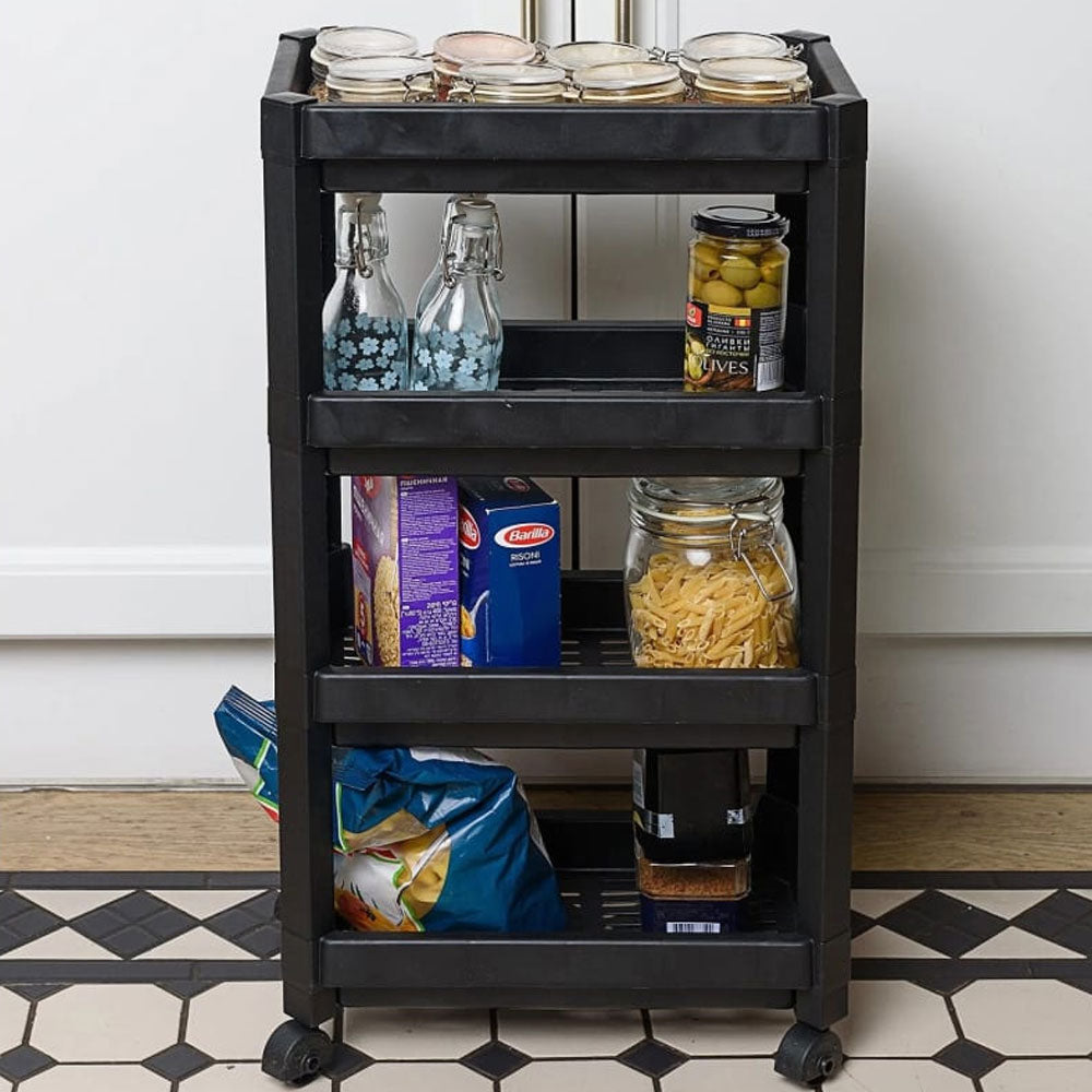Dotato di quattro rotelle per spostarlo facilmente e tre ripiani portaoggetti..