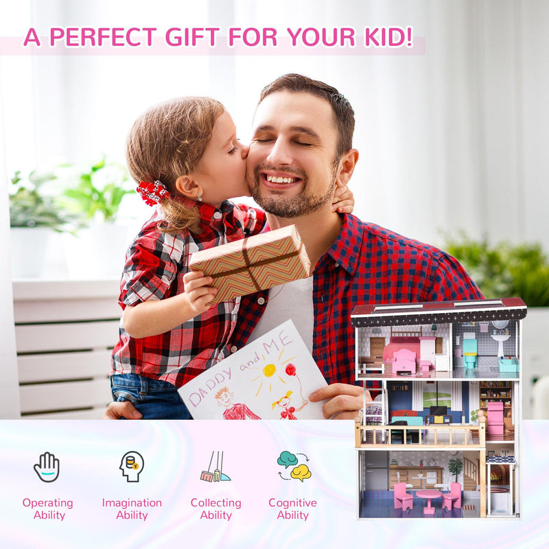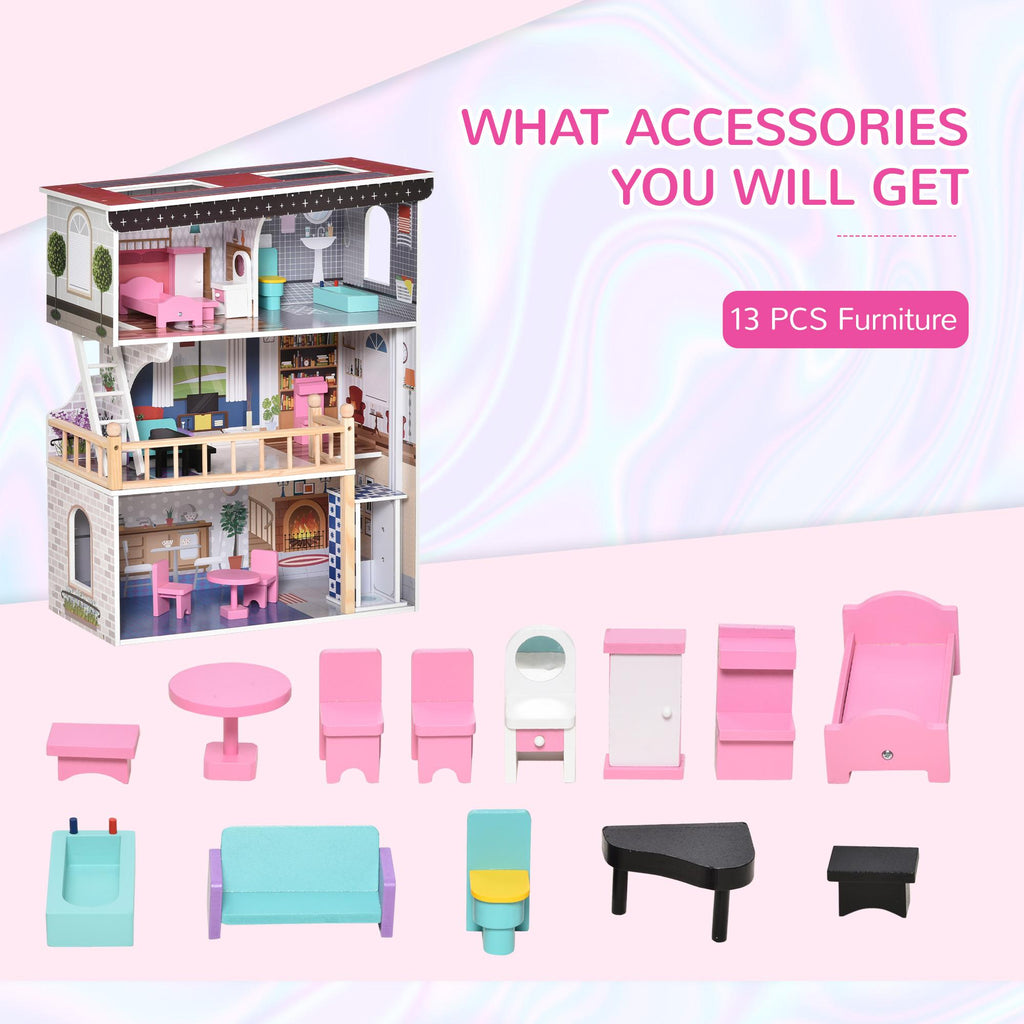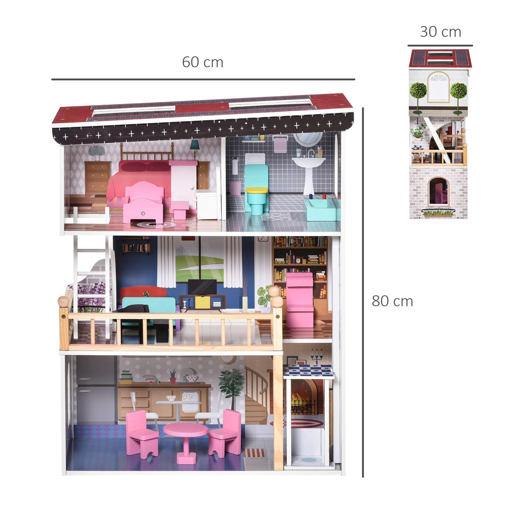 Casa delle Bambole a 3 Piani 60x30x80 cm in Legno Rosa