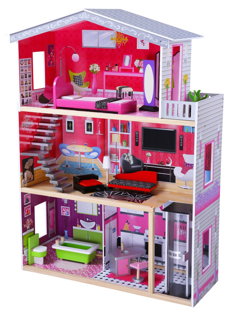Villino Fahion con Altezza compatibile per Fashion doll. Tre piani con doppia scalinata interna e Arredamento completo incluso.