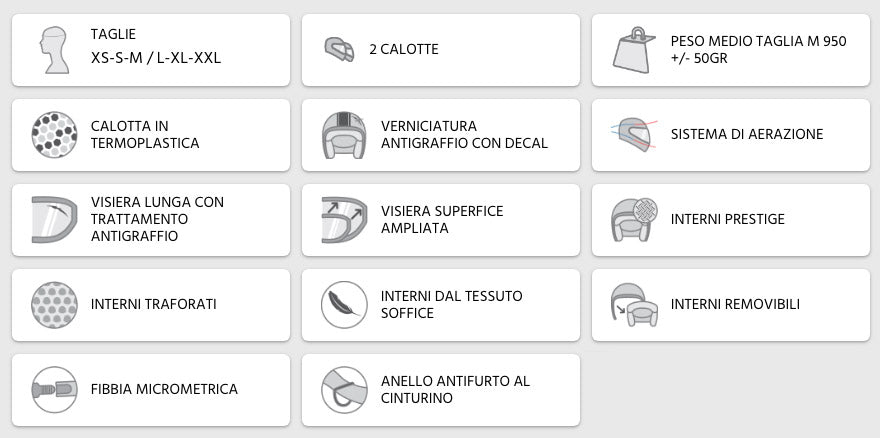 Per una migliore visuale, anche quella laterale, la visiera è stata realizzata con una superfice ampliata, incrementando sicurezza e comfort di guida.