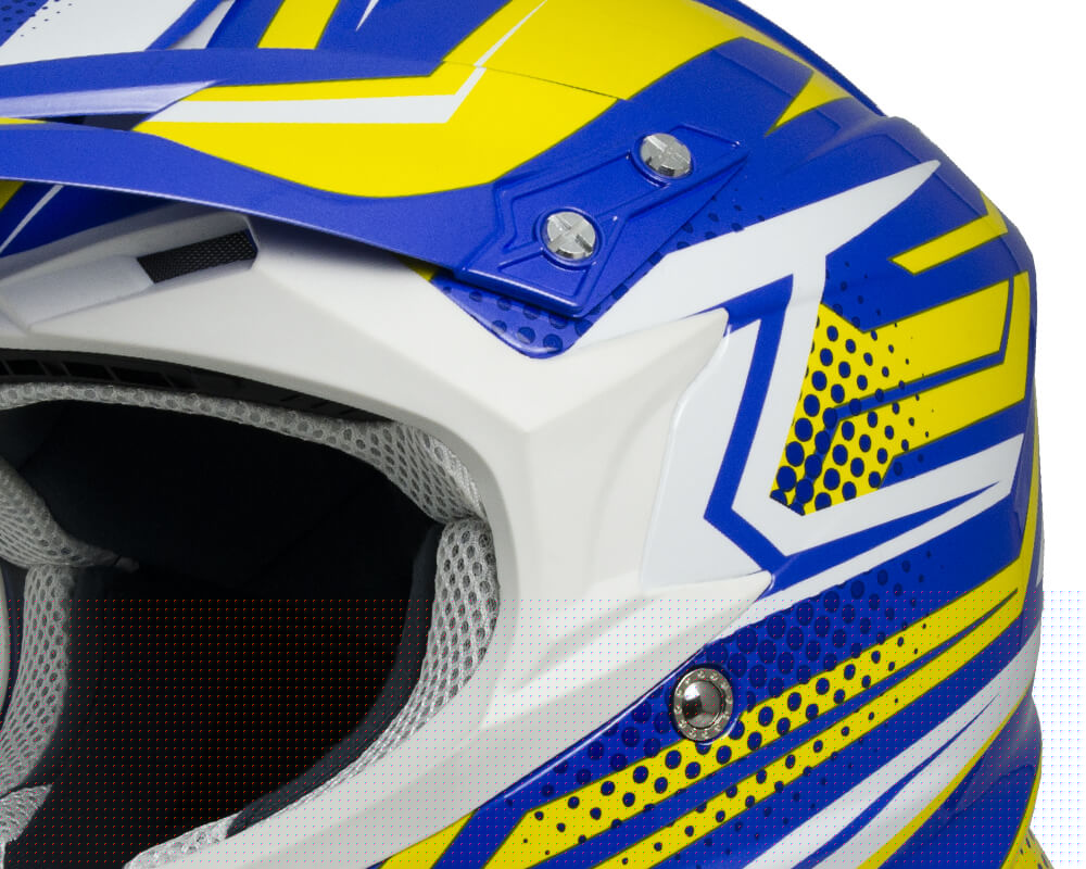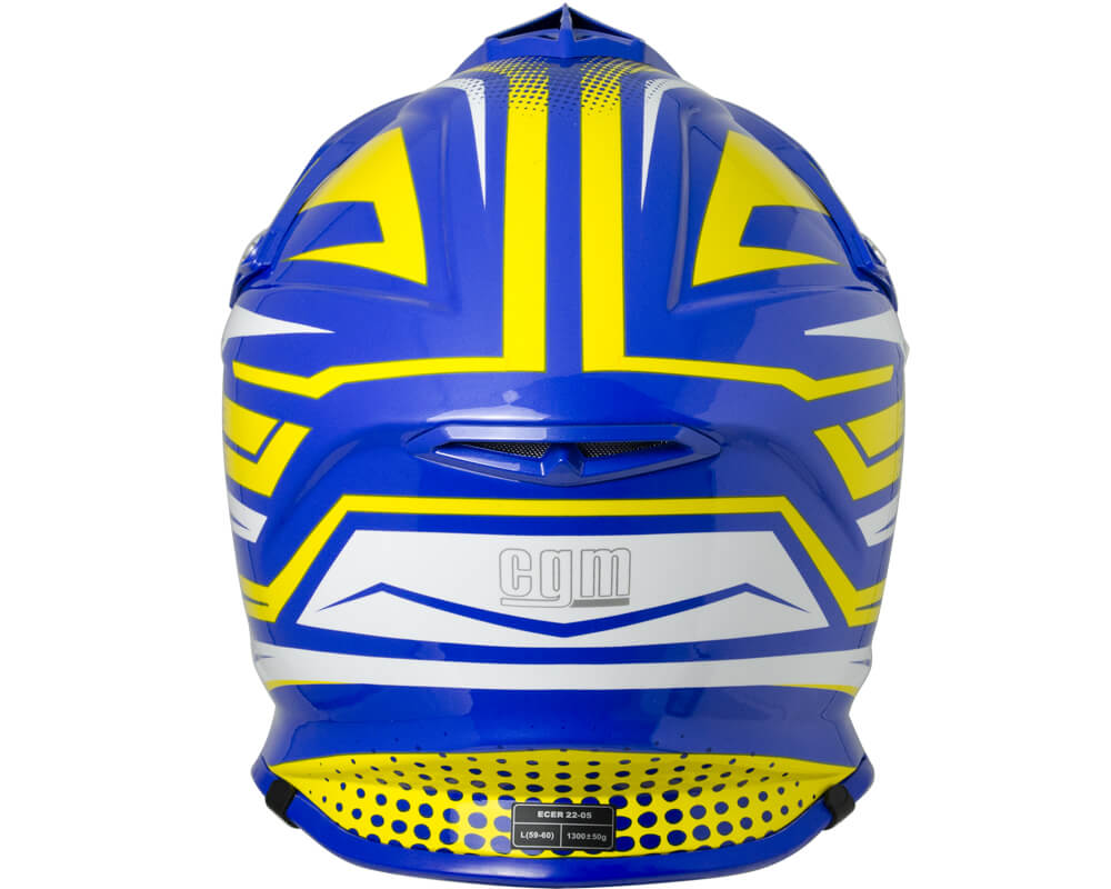 Casco cross di casa CGM realizzato con una calotta dal design estremamente aggressivo che è stata pensata per adattarsi al collare stabilizzatore. Questo casco presenta prese daria con reti a vista e protezione antipolvere sul frontale e sui laterali della mentoniera oltre che sotto il frontino. Gli interni e i guanciali sono completamente amovibili e lavabili, il cinturino dispone di chiusura a doppio anello. La versione 601S è prodotta con coloratissime grafiche che utilizzano le prese daria e le guarnizioni colorate per creare abbinamenti cromatici.