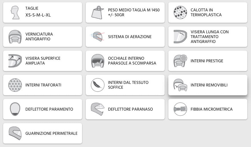 Gli interni estraibili sono fissati alla calotta interna con bottoni automatici, meccanismi in plastica dura o velcro, sono lavabili con un sapone neutro.