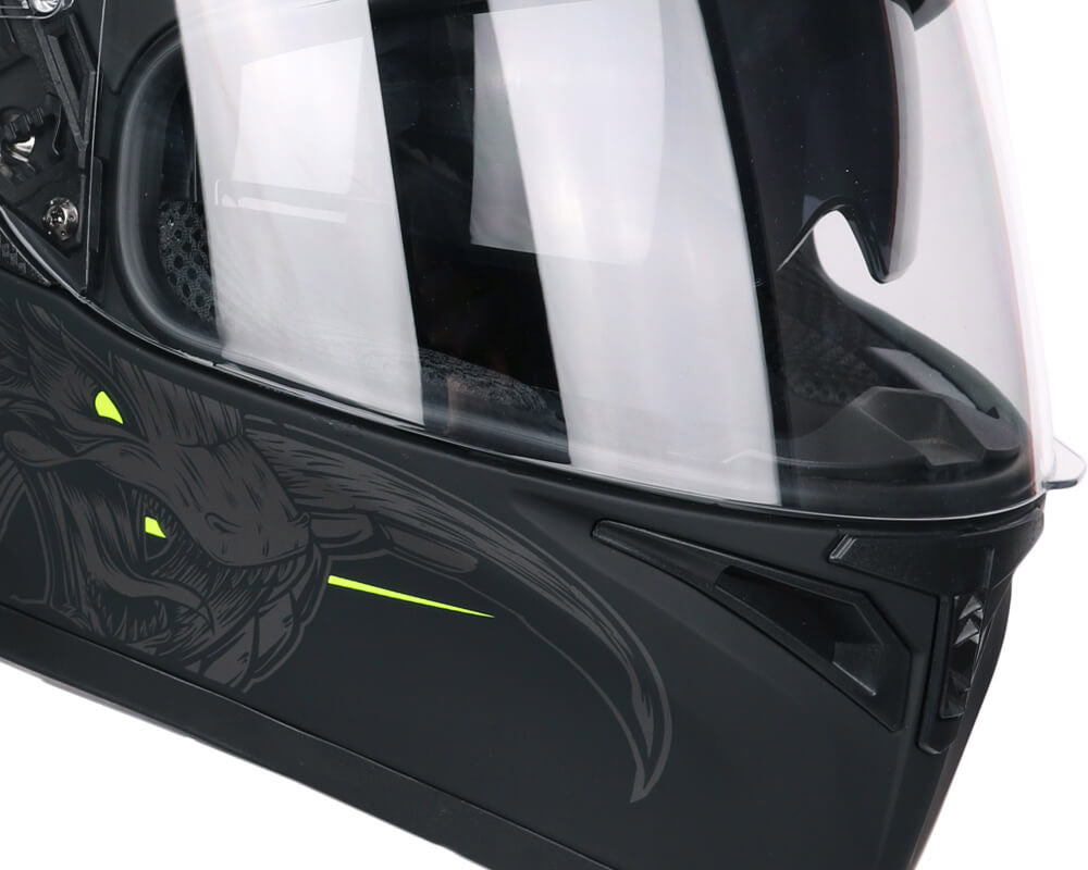 Per una migliore visuale, anche quella laterale, la visiera è stata realizzata con una superfice ampliata, incrementando sicurezza e comfort di guida.