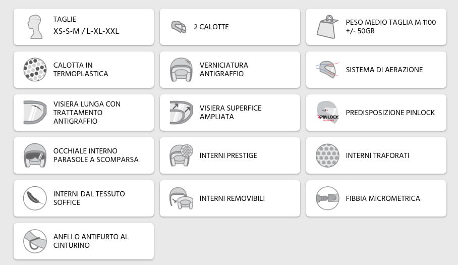 Realizzato in due misure di calotta esterna, per migliorare il comfort di ogni taglia, è dotato di visiera esterna lunga, che si estende fino a coprire il mento, con predisposizione per lente PINLOCK. Dispone di occhiale interno a scomparsa extra fumé regolato tramite la rotazione della placchetta sinistra del casco. È dotato inoltre di un sistema di aerazione che sfrutta le prese d'aria anteriori ed estrattori posteriori, di interni traforati, estraibili e lavabili, arricchiti dalle bande riflettenti posteriori per migliorare la sicurezza passiva.