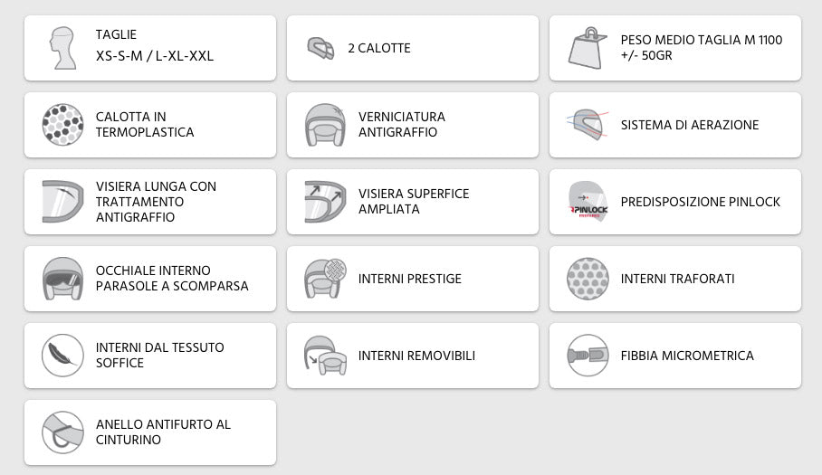 Realizzato in due misure di calotta esterna, per migliorare il comfort di ogni taglia, è dotato di visiera esterna lunga, che si estende fino a coprire il mento, con predisposizione per lente PINLOCK. Dispone di occhiale interno a scomparsa extra fumé regolato tramite la rotazione della placchetta sinistra del casco. È dotato inoltre di un sistema di aerazione che sfrutta le prese d'aria anteriori ed estrattori posteriori, di interni traforati, estraibili e lavabili, arricchiti dalle bande riflettenti posteriori per migliorare la sicurezza passiva.