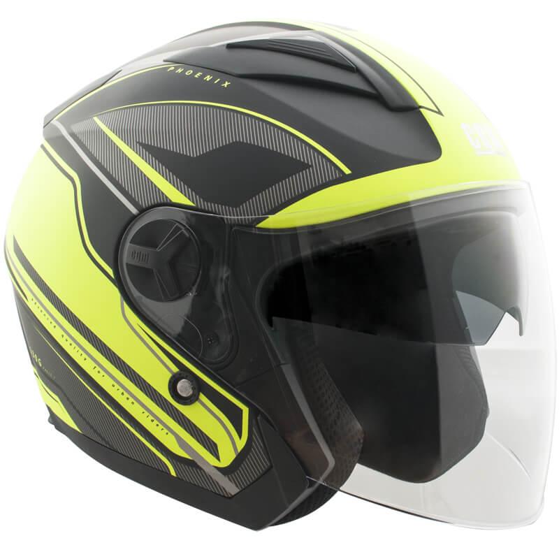 Il Casco Phoenix 130G per Scooter è Realizzato in due misure di calotta esterna per migliorare il comfort di ogni taglia è dotato di visiera esterna lunga per una maggiore protezione dal vento e di occhiale interno a scomparsa extrafumè. dotato inoltre di un sistema di aerazione che sfrutta le prese daria anteriori per canalizzare laria allinterno del casco ed espellere laria calda dagli estrattori posteriori. Gli interni traforati, estraibili e lavabili sono arricchiti dalle bande riflettenti posteriori per migliorare la sicurezza passiva.