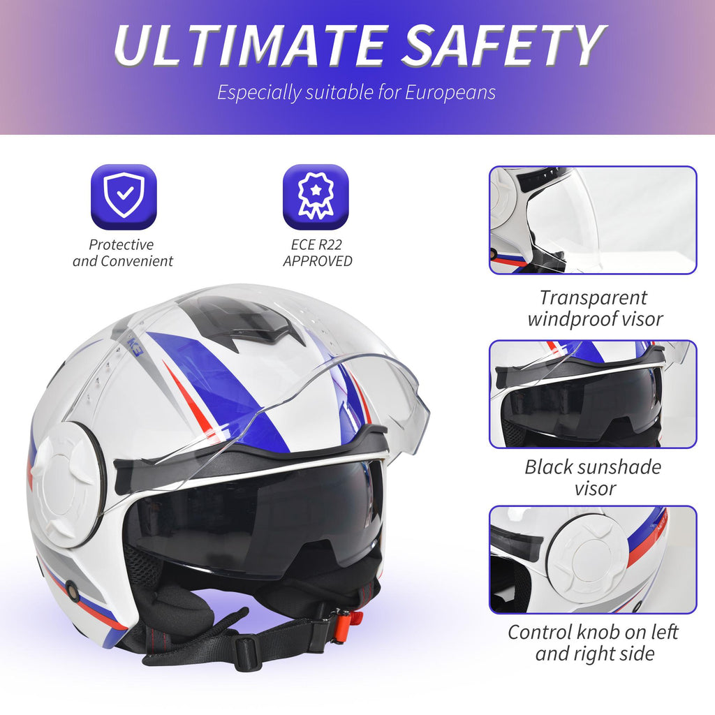 - DESIGN PROFESSIONALE: La visiera di questo casco moto si regola tramite la manopola sui lati destro e sinistro. La visiera esterna trasparente protegge dal vento e dalla pioggia, mentre la visiera interna scura protegge dalla luce del sole per evitare l'abbagliamento e guidare in modo sicuro.
