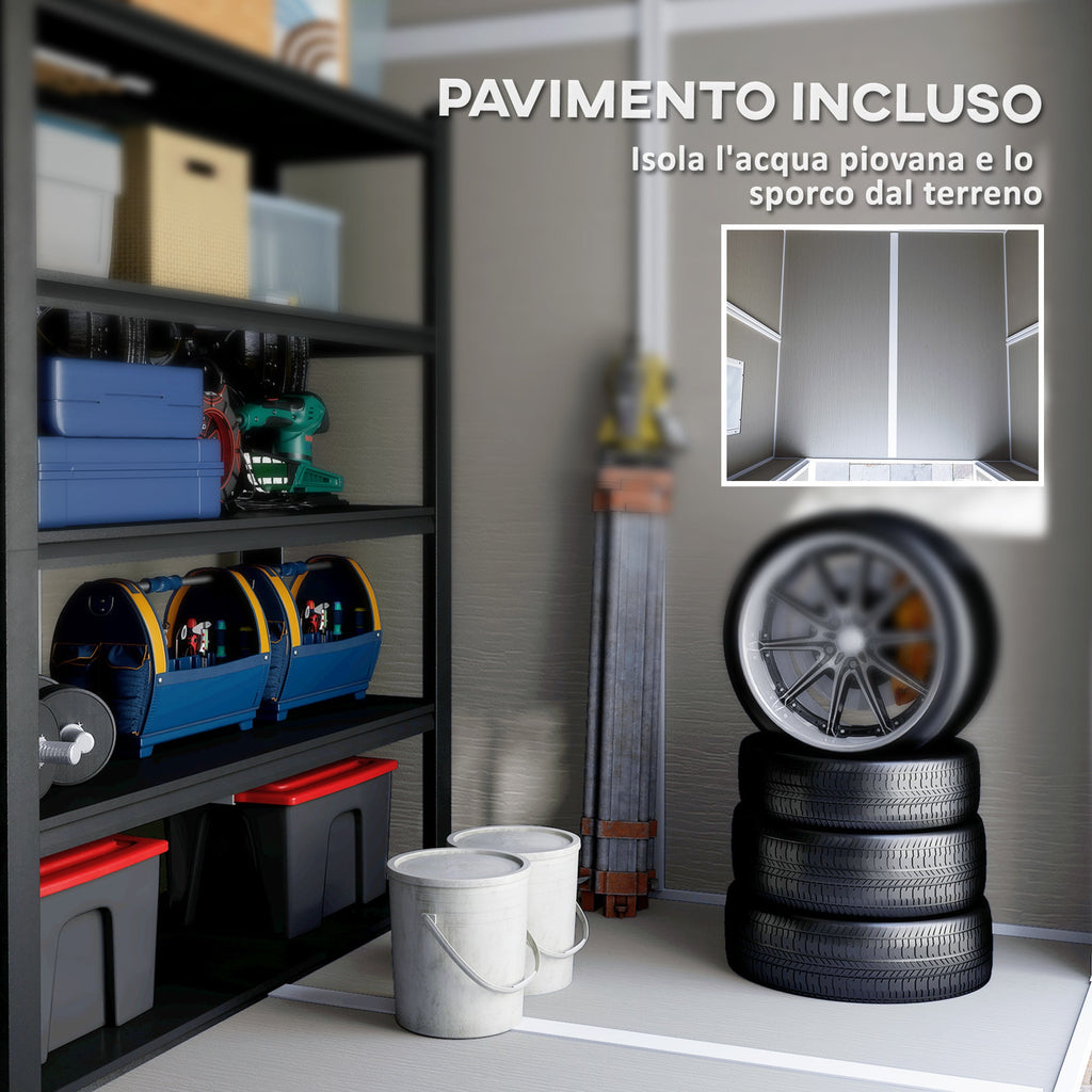 - STRUTTURA IN RESINA E PAVIMENTO: In resina di polipropilene effetto legno da 12 mm con rinforzi in alluminio, questa casetta da giardino è impermeabile, resistente a raggi UV, ruggine o sfaldamento, e include un pavimento per proteggere dall'acqua