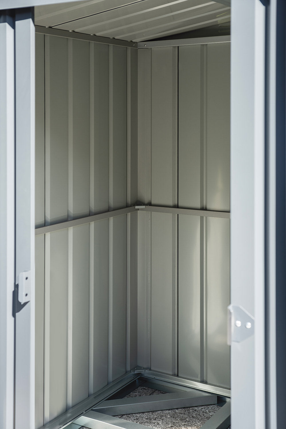 La casetta da giardino è caratterizzata da una struttura con telaio interno triplo e sistema angolare brevettato, realizzata in lamiera color antracite con vernice epossidica garantita per 15 anni. Dotata di porta doppia scorrevole, offre una resistenza al carico neve fino a 100 Kg/m². Con un massimo ingombro compreso tetto di 183 x 154 x H 193 cm, le misure interne sono di 161 x 130 cm e la porta misura 63,5 x 170 cm. Ideale per chi cerca una soluzione resistente e funzionale per il proprio spazio all'aperto.