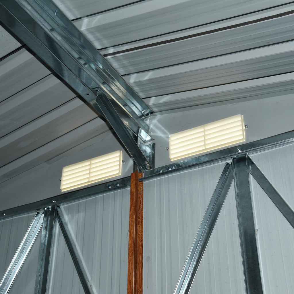 - TETTO INCLINATO: La casetta per attrezzi è dotata di tetto inclinato, che assicura lo scivolamento dell'acqua per evitare la formazione di ruggine. PRESE D'ARIA: Le due prese d'aria frontali favoriscono una ventilazione ottimale all'interno del capanno, per tenere alla larga l'umidità.