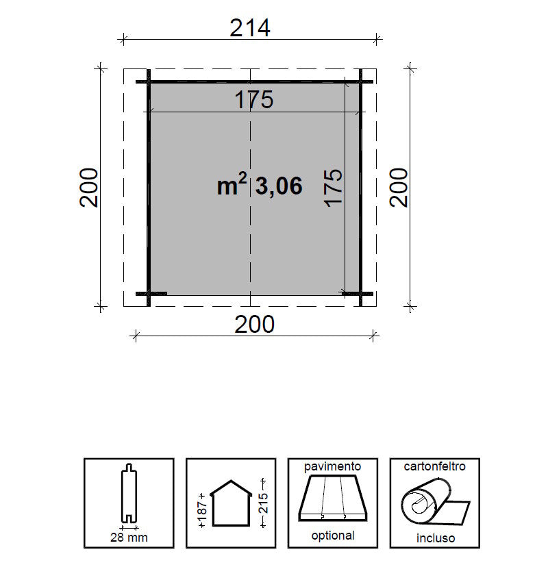 Le dimensioni di 200x200 cm a terra e 175x175 cm interne offrono uno spazio funzionale di circa 3,06 mq, ideale come deposito, zona relax o spazio per hobby. L’altezza massima di 215 cm e le pareti alte 187 cm permettono un utilizzo confortevole e pratico.