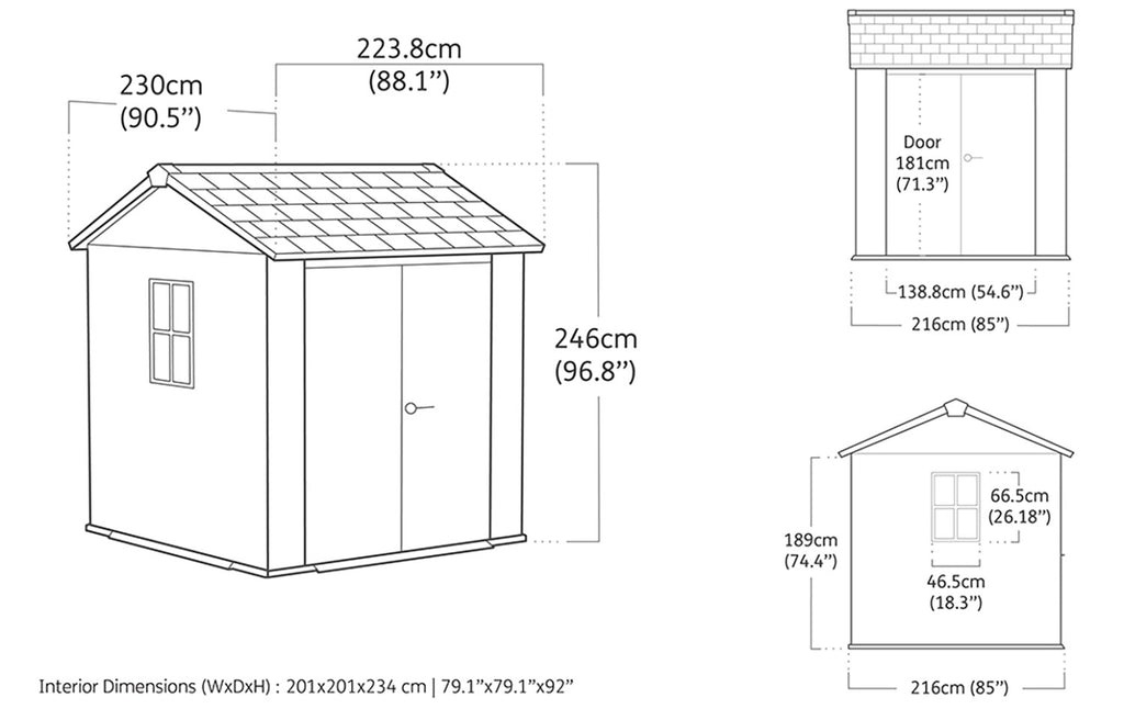 Con una larghezza esterna di 230 cm e una profondità di 223.8 cm, offre una superficie di 4.04 metri quadrati. L'altezza esterna è di 246 cm, mentre l'altezza interna è di 234 cm, offrendo un volume di 8.66 metri cubi. La porta a due battenti ha una larghezza di 138.8 cm e un'altezza di 181 cm, facilitando l'accesso. Possibilità di chiusura con lucchetto (non fornito) per una maggiore sicurezza.