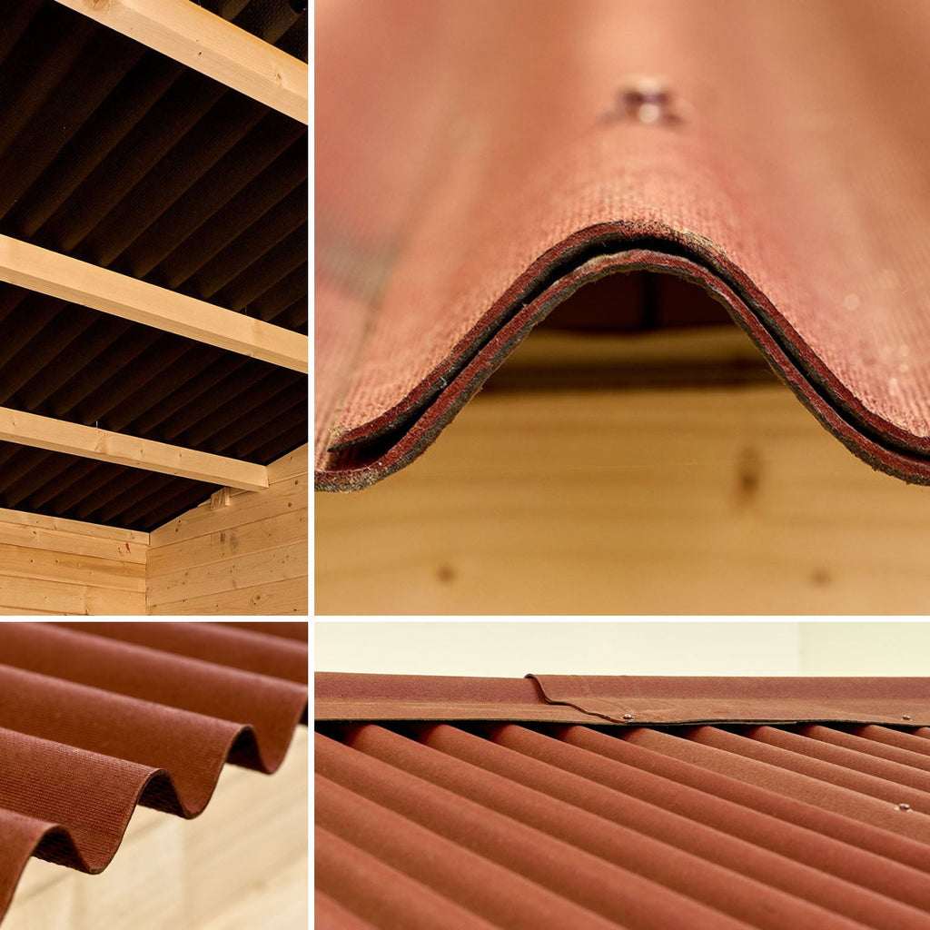- Copertura: lastre ondulate bitumate colorate, con accessori( chiodi a testa plastica stampata e tegole di colmo ) dello stesso colore del tetto.