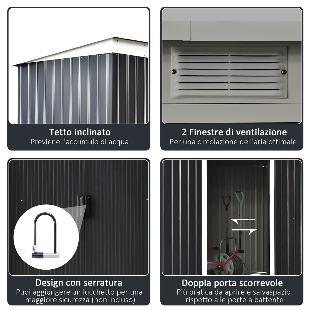 Non hai abbastanza spazio in giardino per tenere i tuoi attrezzi? Con la casetta porta attrezzi di risolvi il problema! È realizzata in acciaio galvanizzato per resistere nel tempo e garantirti stabilità. La doppia porta scorrevole ti permette di entrare facilmente e di risparmiare spazio all'interno della casetta da giardino. Sono presenti anche 2 finestre di ventilazione per tenere il capanno per gli attrezzi asciutto e prevenire la formazione di umidità. La pavimentazione e le componenti per il montaggio sono incluse.