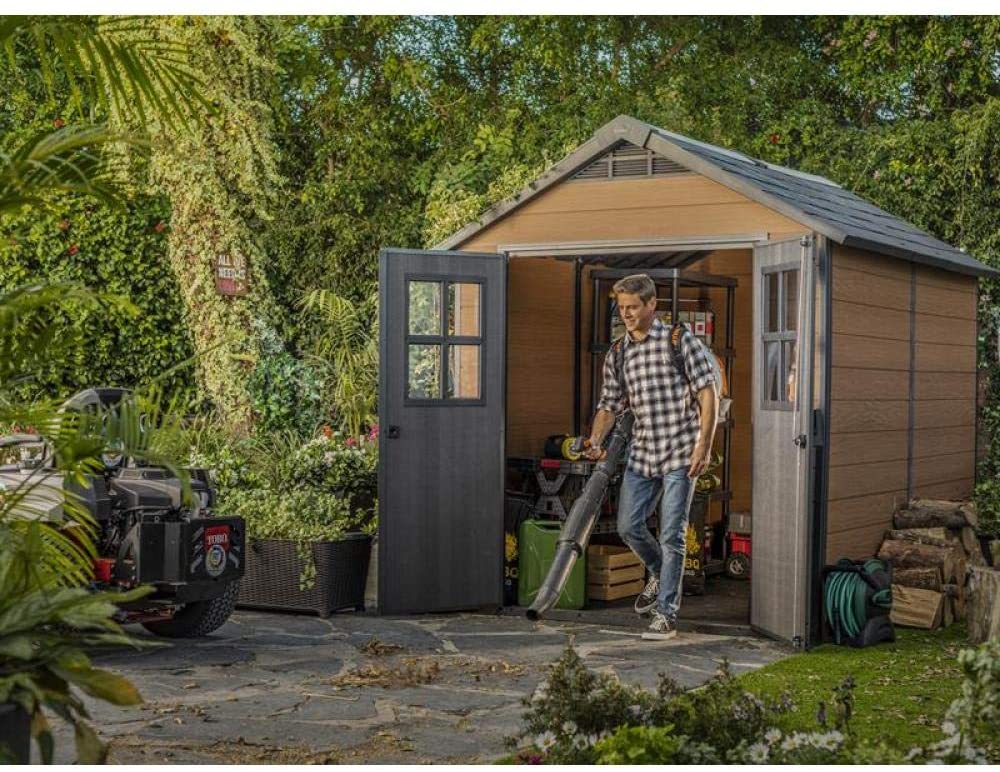 Casetta dal design classico con tradizionale finitura effetto legno, dotata di elevata resistenza e durabilità. La struttura realizzata con pannelli a doppia parete e con rinforzi in metallo resistente agli agenti atmosferici (eccetto gli eventi climatici più estremi). Il pavimento rialzato protegge il contenuto da fango e acqua, mentre il lucernario e le due finestre frontali forniscono alla casetta un'illuminazione naturale. Realizzata con innovativi pannelli in EVOTECH+™, particolare finitura che riproduce l'effetto del legno naturale, senza però le costanti manutenzioni di cui necessita il vero legno.