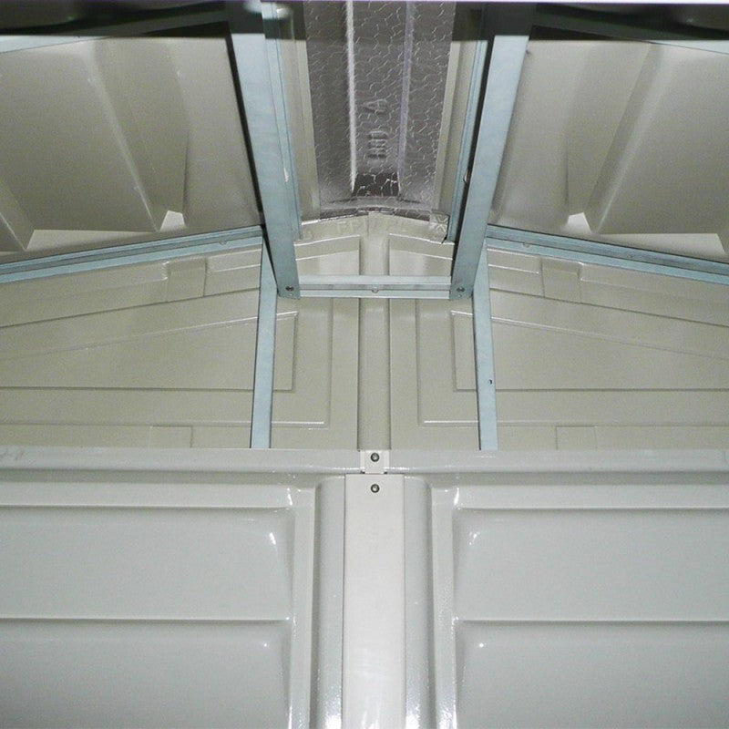 La casetta è supportata da travi interne in acciaio zincato resistente. Anche le pareti laterali sono rinforzate con una struttura solida di metallo, che conferisce resistenza alle casette e consente il montaggio di ripiani e l'aggancio di attrezzi da giardino. Queste casette sono testate per resistere a forti venti (fino a 180 km/h se propriamente ancorate a terra) e per un carico di neve fino ad un massimo di 100 kg/m2. Queste casette di qualità sono garantite per 15 anni (la garanzia più lunga del settore!).