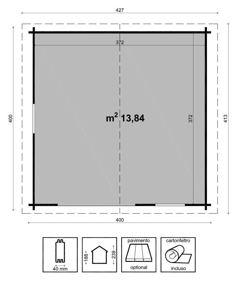 - Dimensioni interne cm 372x372