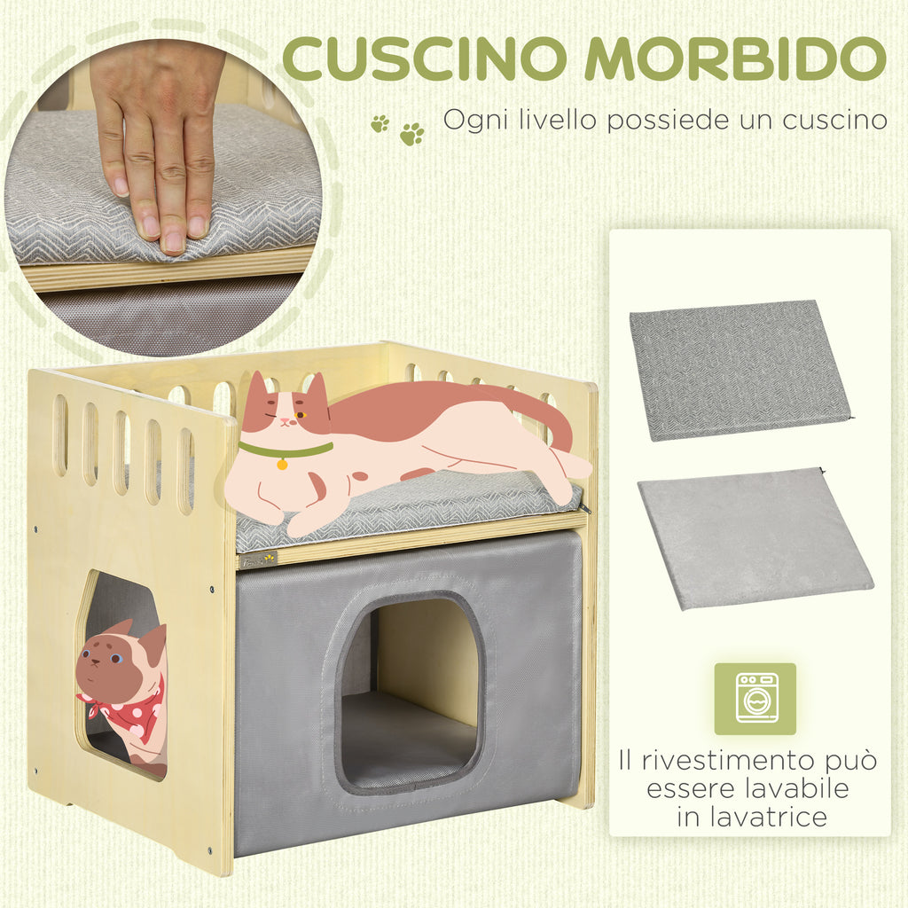 Casetta per Gatti 2 Livelli 48x38x47 cm con Cuscini Rimovibili e Guide di Sicurezza in Legno e Tessuto Grigio e Bianco