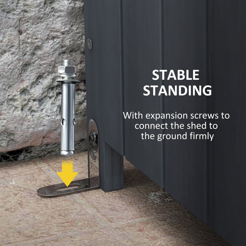 - Le viti sui piedi della casetta porta attrezzi possono essere fissate saldamente al terreno