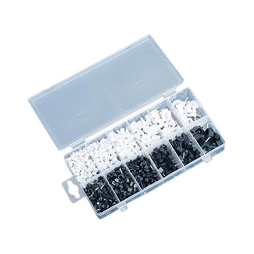 Pratica confezione 390 pezzi chiodini fermacavi, blocca cavi, in cassetta di plastica con separatori.