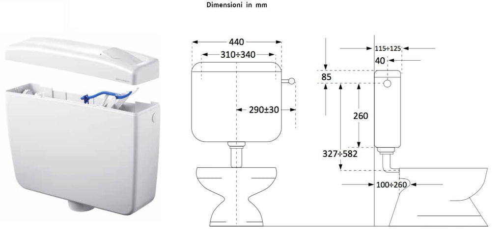 La cassetta esterna universale si adatta con estrema facilità su tutti gli impianti e su tutti i sanitari tradizionali.