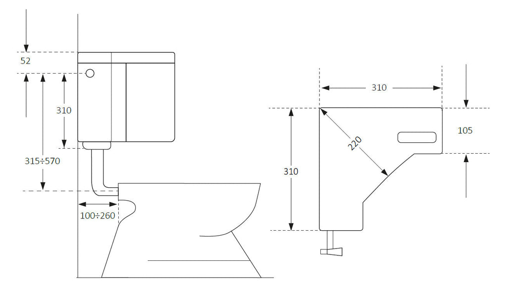Cassetta WC Angolare Esterna in ABS con trattamento anti invecchiamento, dotata di un pulsante di scarico, con funzione economizzatore d'acqua start/stop, essenziale per ridurre al minimo gli sperchi d'acqua senza rinunciare alla massima efficienza.