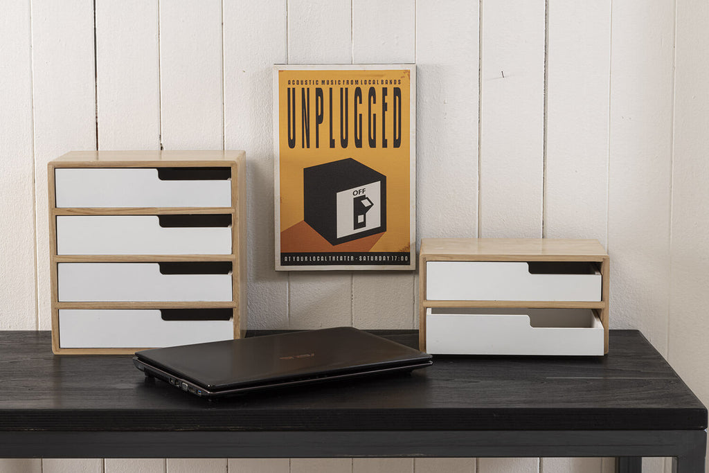 Cassettiera da scrivania o interno mobili struttura in legno paulownia verniciato naturale e 2 cassetti in Mdf verniciati bianchi con presa sia a sinistra che a destra.