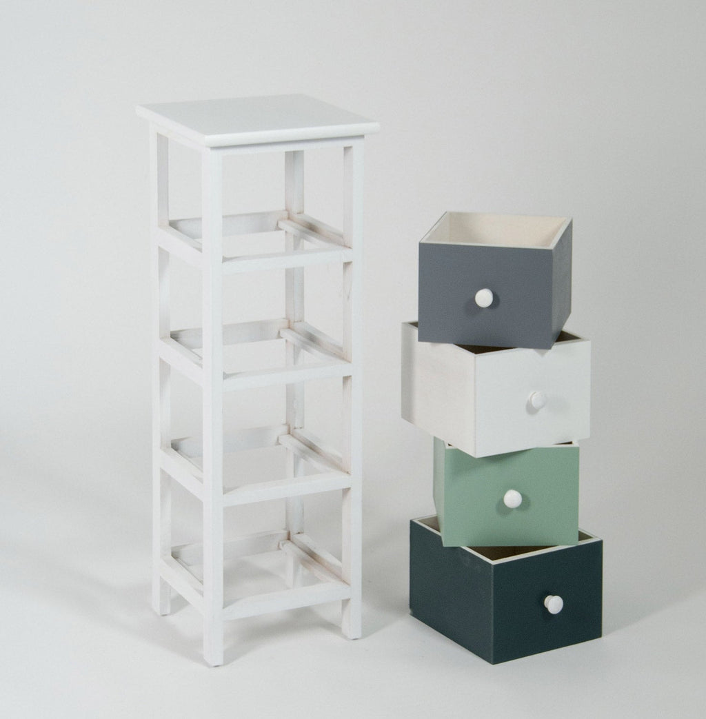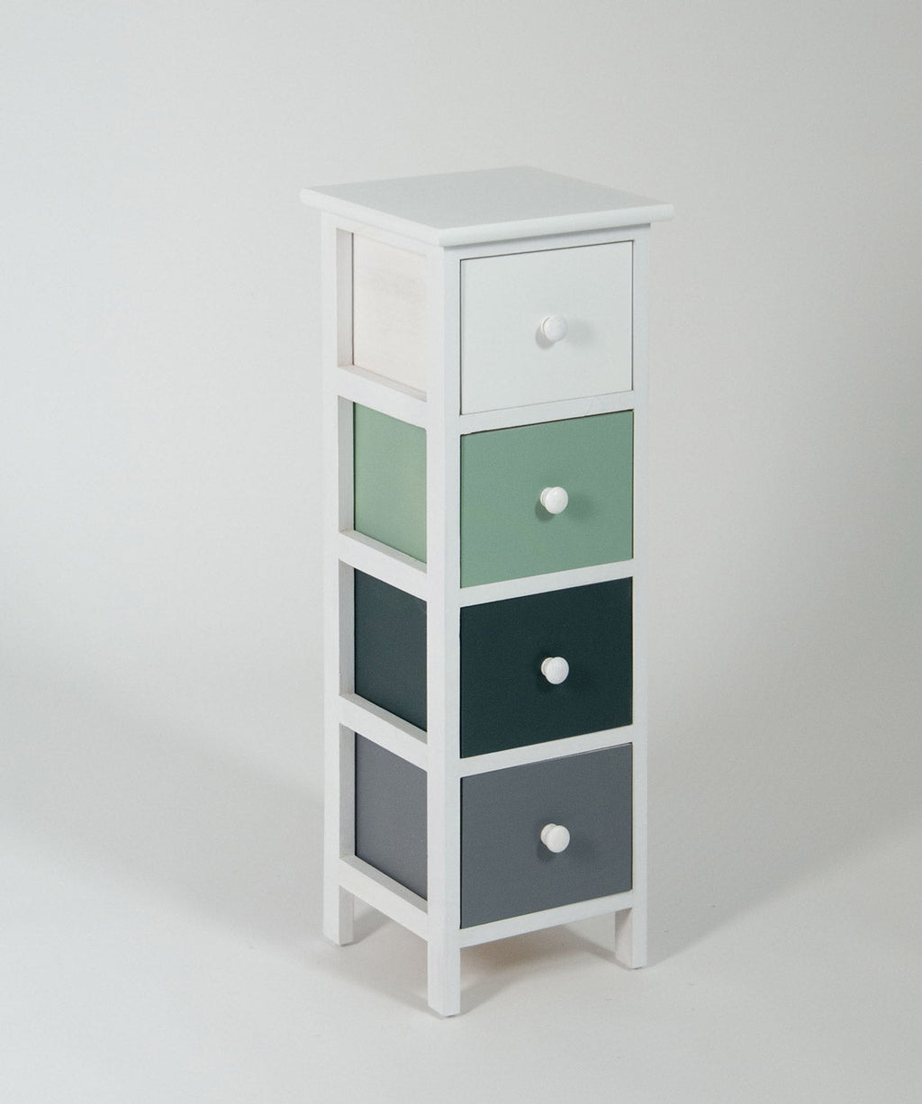 Casettiera in legno massello di paulownia, finitura artigianale a mano. Dotata di 4 cassetti in legno colorati.