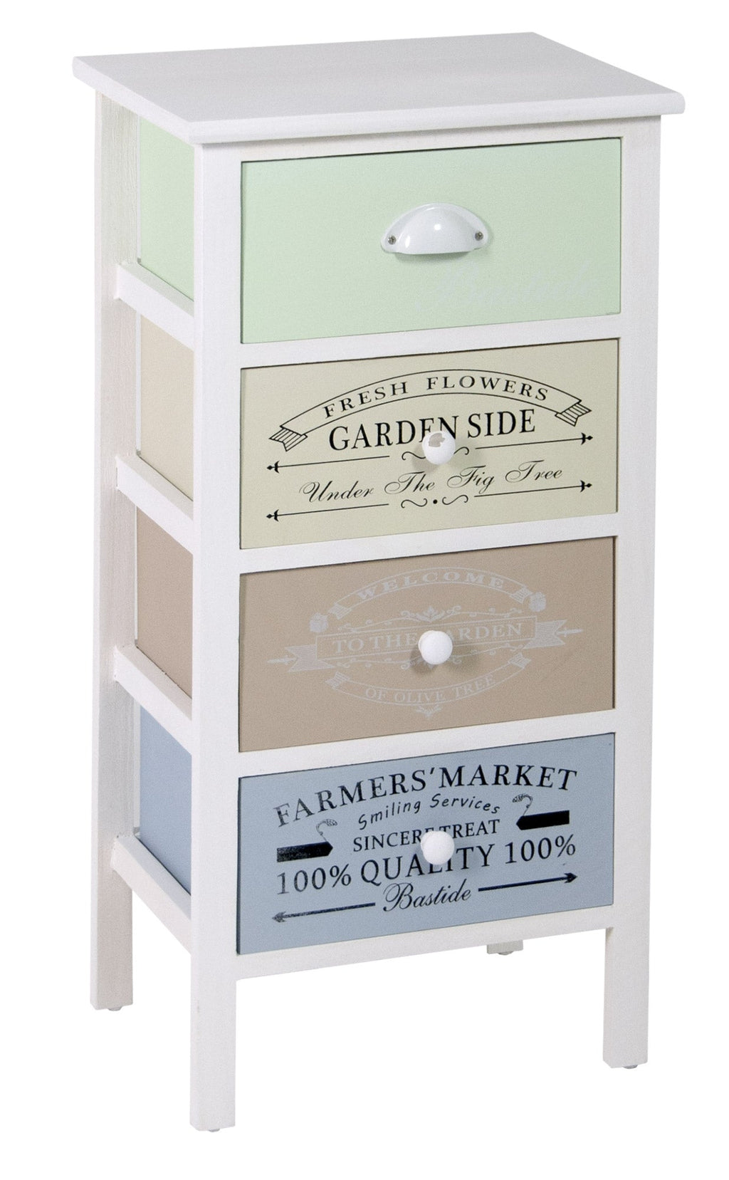 Casettiera in legno massello di paulownia, finitura artigianale a mano. Dotata di 4 cassetti in legno colorati e stampati.