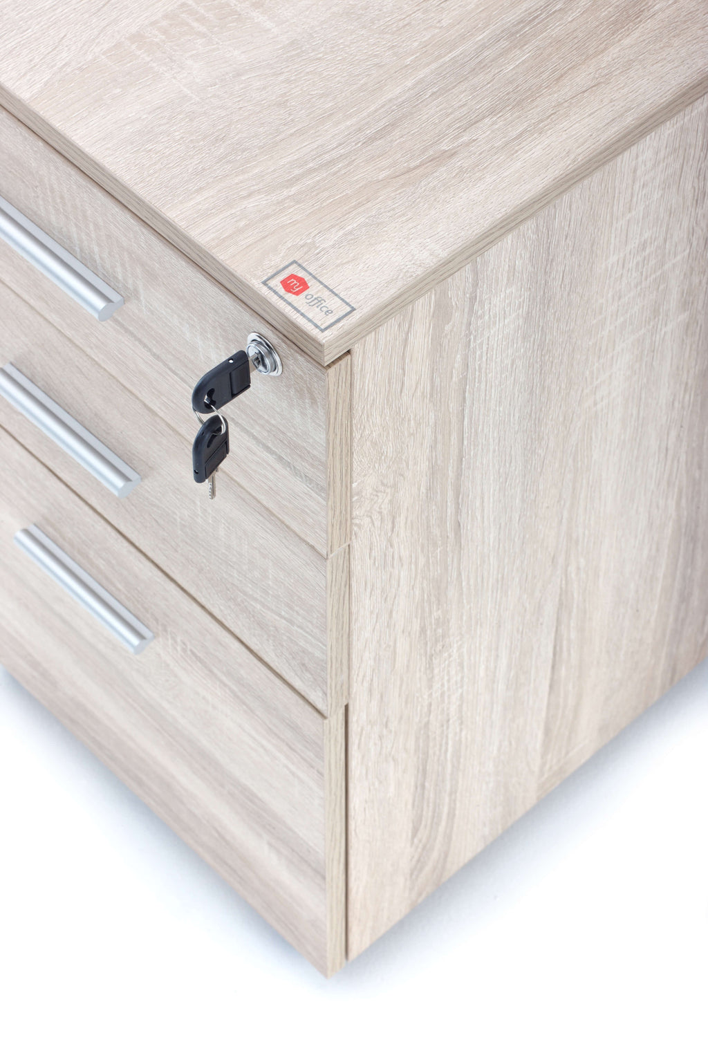 Cassettiera Chest con 3 cassetti dotati di chiusura con chiave estraibile, la struttura è in MDF di colore rovere. Eleganti maniglie in acciaio satinato si adattano ad ogni arredo ufficio, facili da afferrare. dotata di 5 ruote girevoli che permettono di spostarla facilmente senza avere intralci, 4 si trovano alla base della cassettiera e la quinta scorre sotto l'ultimo cassettone in basso durante l'apertura. Ideale da mettere sotto una scrivania sprovvista di cassetti, per avere tutto sempre a portata di mano e in ordine.