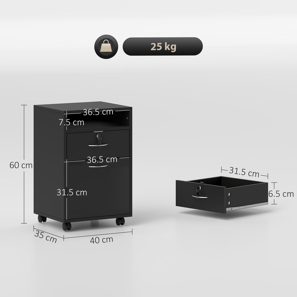 Cassettiera Portadocumenti a 4 Ruote 40x35x60 cm Cassetto con Serratura e Armadietto in Legno Nero