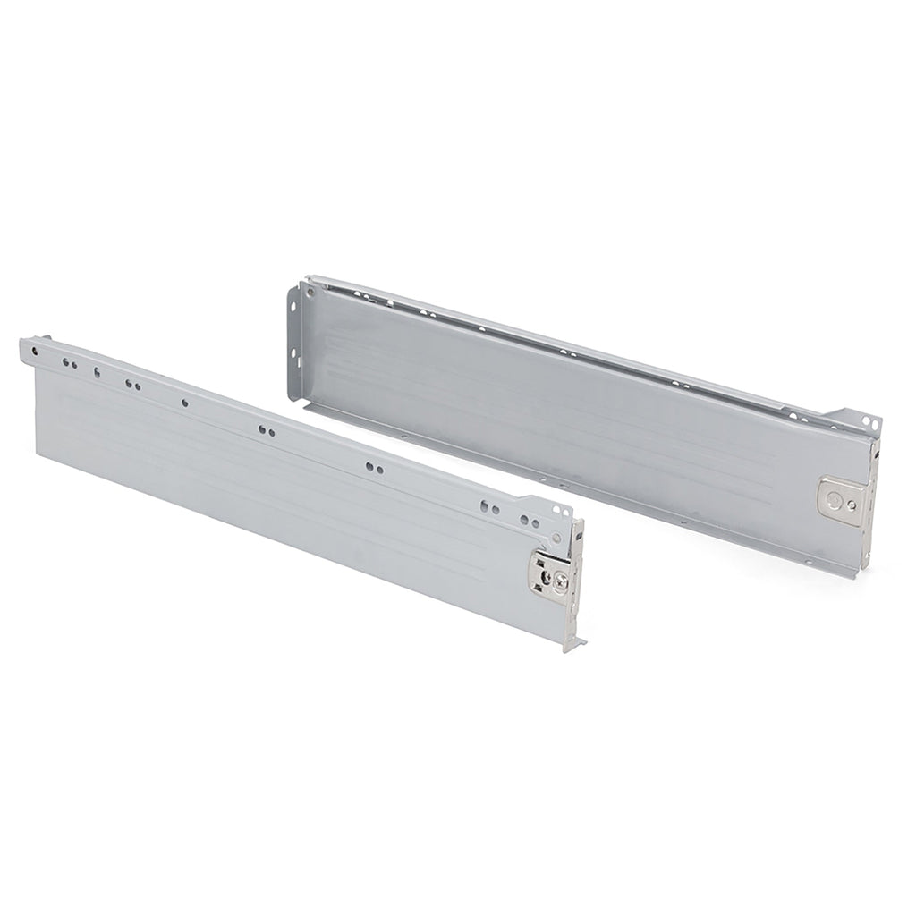 Il kit per cassetto da cucina e bagno Ultrabox è composto da profili lateriali in acciaio con guide a rotella, progettate con finiture verniciate in alluminio. È la migliore opzione con il miglior rapporto qualità -prezzo per cassetti da cucina e bagno. Ogni kit include tutti gli accesori per il montaggio di un cassetto: profili laterali, set di guide con caduta e agganci anteriori per il frontalino. Necessita di pannelli tagliati a misura per il fondo e la schiena oltre al frontalino del cassetto. Gli aggangi di fissaggio del frontalino permettono la regolazione eccentrica ± 2 mm verticale. Questi agganci sono già montati sul lato della sponda in acciaio.