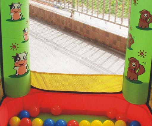 Entra in un mondo di pecore, mucche e maialini grazie al nostro castello Fattoria! Completo di scivolo di piccole dimensioni, vasca per palline (incluse), canestro e superficie per saltare. Fantastici disegni di diversi animaletti della fattoria sulle 4 colonne interne.