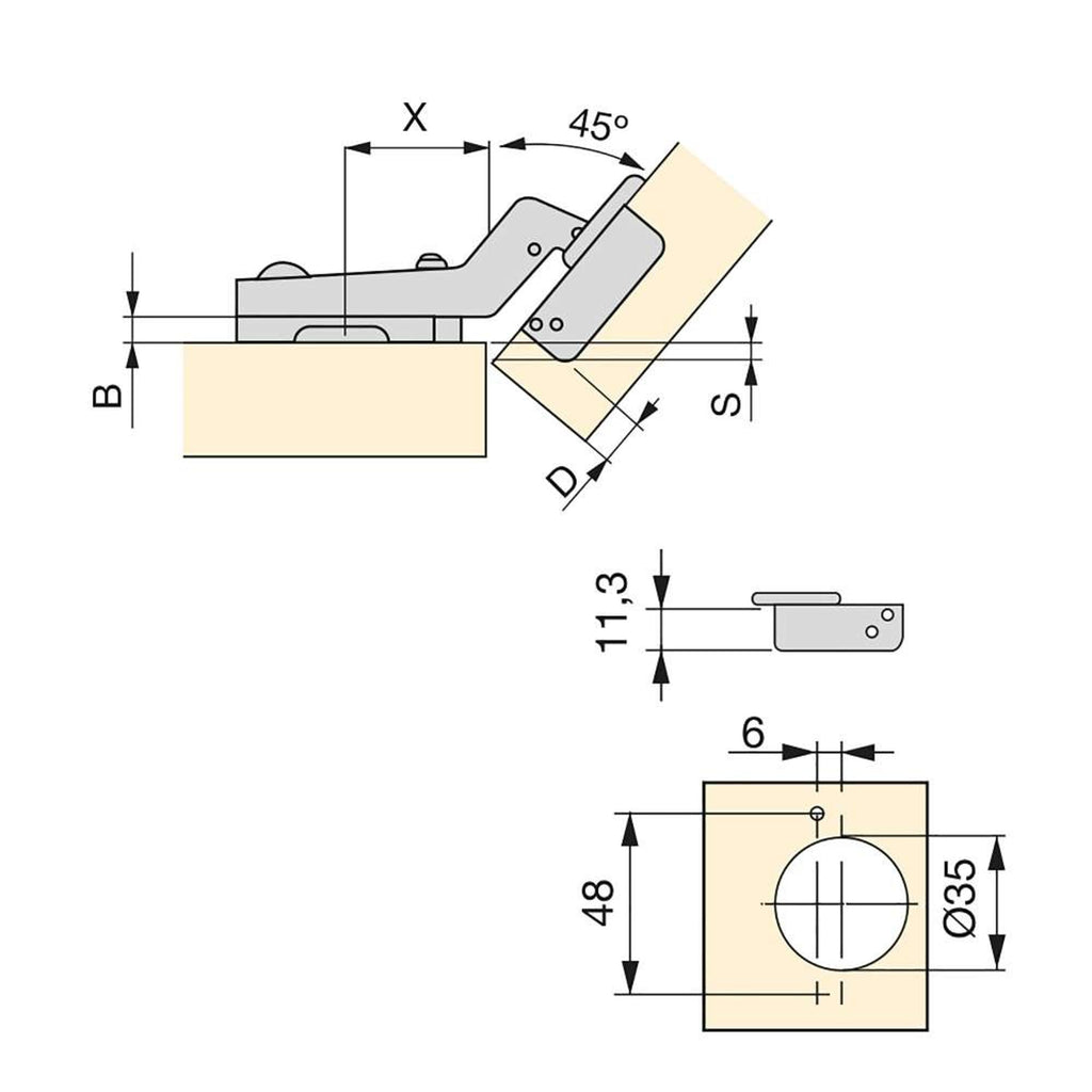 Sono disponibili nella versione con braccio angolare di 45° con apertura dell'anta di 95°. Per la sua istallazione è necessario un foro diametro di 35 mm per lo scodellino. Il suo fissaggio al pannello avviene mediante le vite incluse.